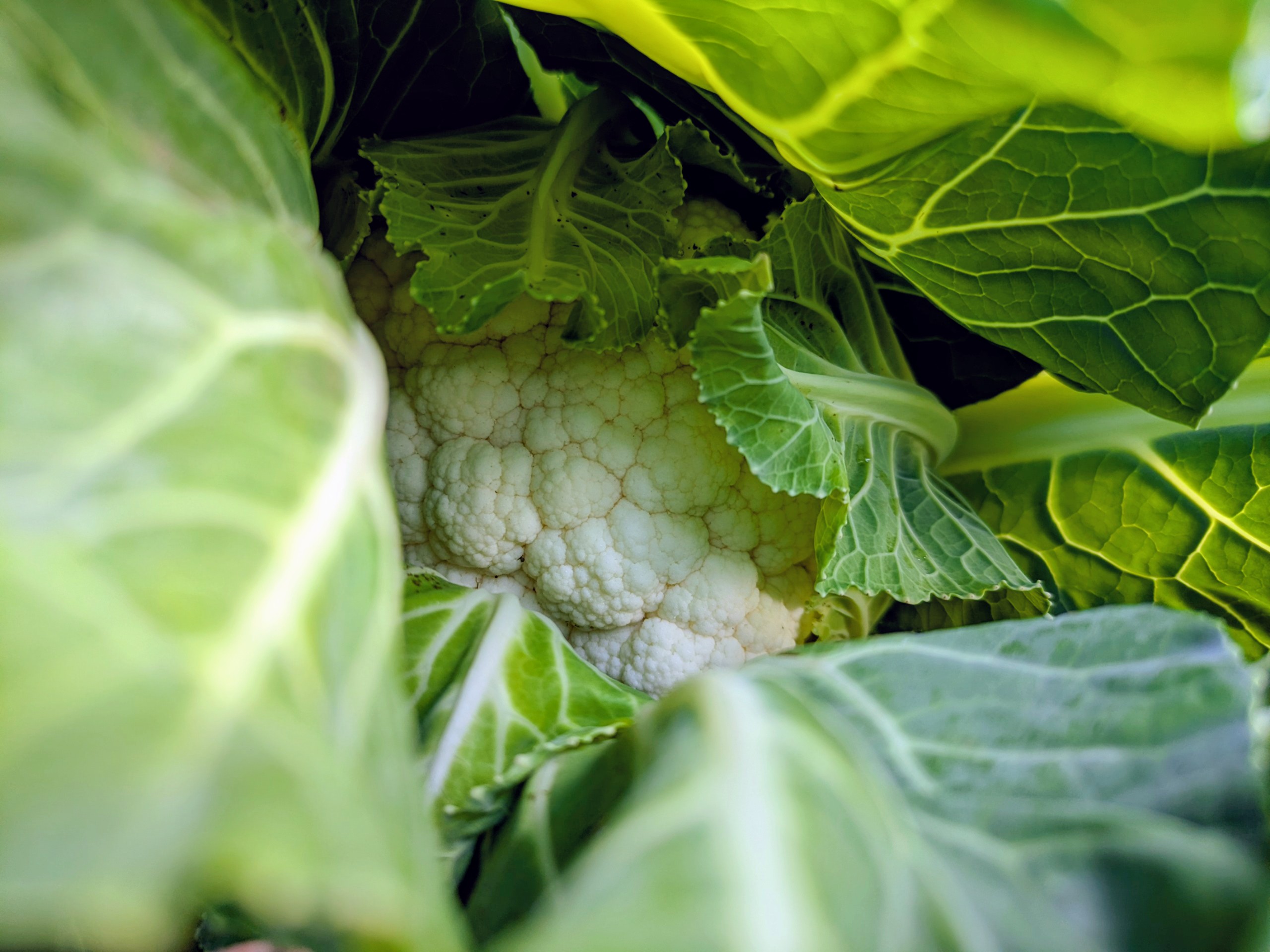白く美しい花蕾が見えてきました。直径10cmくらいのミニサイズで収穫です。生でも食べられるカリフラワーですが、美しすぎて食べるのがもったいなく思えてしまいますね。