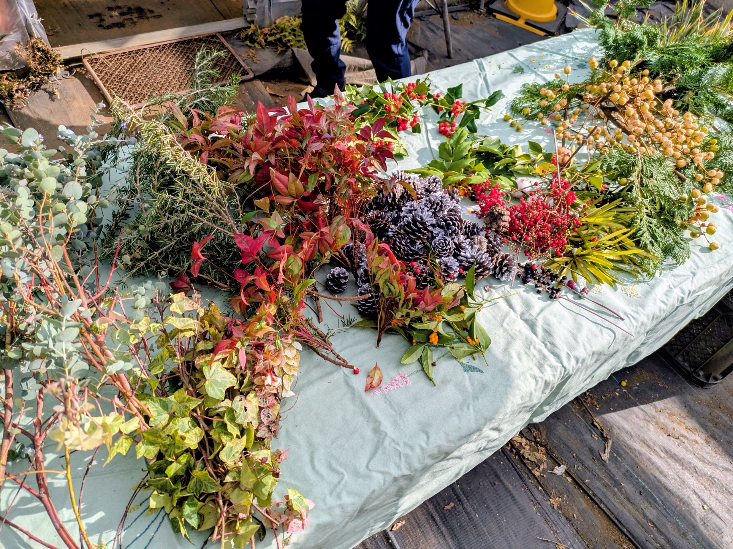 飾りつけの素材は、自然の植物やリボンなど、クリスマスにもお正月にも使えそうなものをたくさんご用意しました。